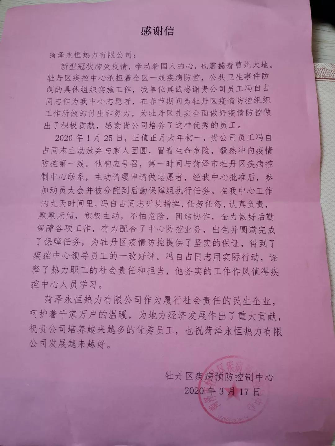 2020年初,疫情来袭,牵动着国人的心,也深深牵动永恒热力运营管理二部管理员冯自占的心,一夜辗转反侧后,他第一时间与菏泽市牡丹区疾病控制中心取得联系,主动请缨申请做志愿者,经批准,被分配到后勤保障组执行任务。1月25日,正值正月大年初一,冯自占主动放弃与家人团圆,冒着生命危险,义无反顾冲向疫情防控第一线。“我不是医生,不能再次奔赴前线,救危难于生死,那我就多做些力所能及的事情”,事实上冯自占也是这么做的,他出色并圆满完成了保障任务,被牡丹区疾病预防控制中心授予了“新型冠状病毒肺炎防控优秀志愿者”称号。